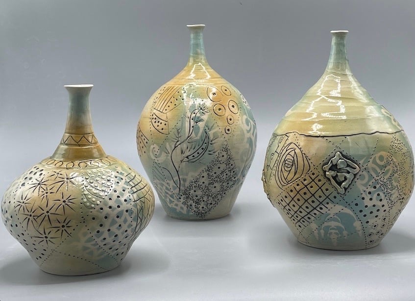 Ceramics artistically made by hand on a wheel, hand carved and hand painted.
